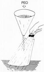 搅拌器:搅拌器为二层式,叶片外倾角度为45°,其旋转方向使液体向下流动,上层浆在液面附近以降低PEO的悬浮及除去泡沫。 搅拌速度:最佳搅拌速度为搅拌翼端圆周速度1米/秒钟。由于PEO是一种高分子树脂,过快的搅拌速度会将其长链切断,使其粘度降低。搅拌速度在1.5米/秒钟以上时,将影响PEO的品质,但如果搅拌过慢,PEO很难完全溶解,因此,要选择适宜的搅拌速度。 2、在溶解槽上部安装一凹槽式扇形斜板以利于供水时形成水膜,慢慢地将PEO粉末洒在水膜上冲入槽中。 投料速度:投料速度要慢且均匀,投料过快PEO易结成难溶的块状物。如已形成结块物应予弄松粉碎,否则会形成糊状悬浮物而影响使用效果。 3、投料完后将水灌满溶解槽,间隙搅拌1.5小时,使用前静止二十分钟。 存放时间:溶解后的PEO要及时使用,存放时间不宜超过48小时,溶解浓度越低,存放时PEO降解越快,一般12小时用完效果最佳。 |